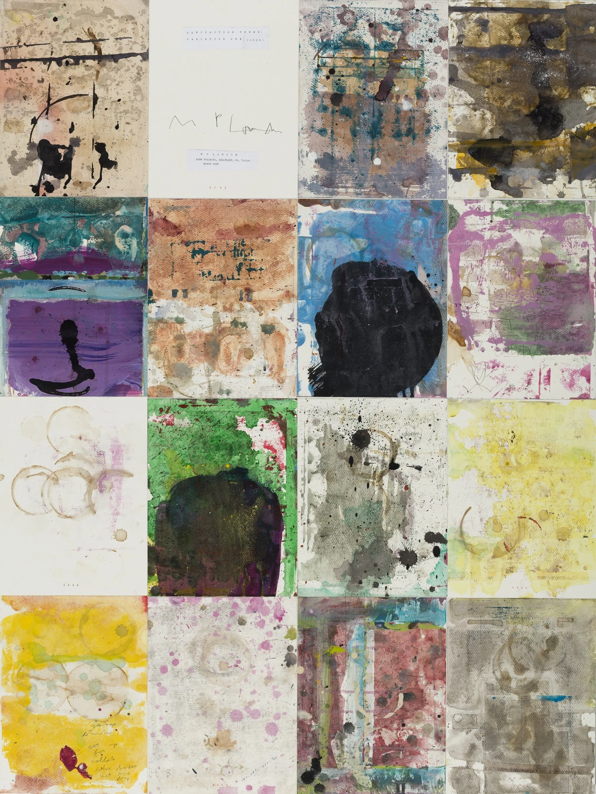 As the artist describes: “Since February of 2020, I have begun 60 new pieces each month. They start in the home as informal note paper, used as coasters and sometimes to doodle and write ideas and lists, phone numbers and messages. At the end of each month, this somewhat marked and stained pile is taken to the studio for further use. From the many that are in process, I choose 15 each month to sign, title and date as finished.”