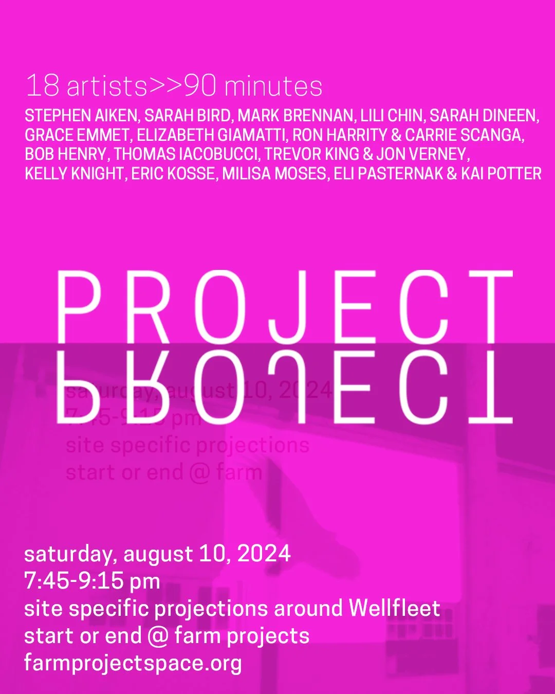 Wellfleet, MA (August 2024) – Farm Projects is pleased to present PROJECT/PROJECT. This pop-up event features approximately 15 site-specific projections by artists from across New England and beyond that will transform twilight for 90 minutes on Saturday, August 10. Participating artists include Stephen Aiken, Mark Brennan, Sarah Dineen, Elizabeth Giamatti, Bob (Robert) Henry, Thomas Iacobucci, Kelly Knight, Sarah Bird, Trevor King, Eric Kosse, Kai Potter, Eli Pasternak, Carrie Scanga and Ron Harrity, Lili Chin, Grace Emmett, Milisa Moses, and Jon Verney.