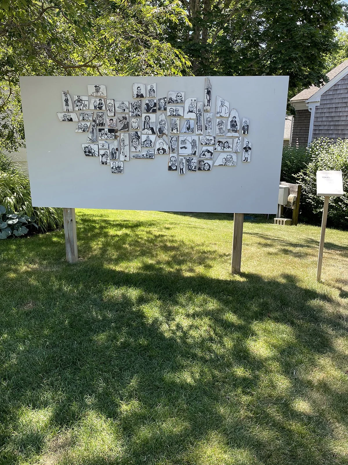 Yokel is an outdoor art installation by artist Megan Hinton. Remnants of painted lumber are arranged as multiple portraits depicting Outer Cape Cod locals. Typically, a pejorative and ethnocentric label, yokel is humorously recontextualized to caricature the folks who live here. They are artists, writers, performers, entrepreneurs, essential workers, eccentrics, activists, leaders, friends, acquaintances, and much more. The play on local yokel’s vernacular is reinforced with black and white gestural cartoon marks on informal surfaces of discarded construction wood.