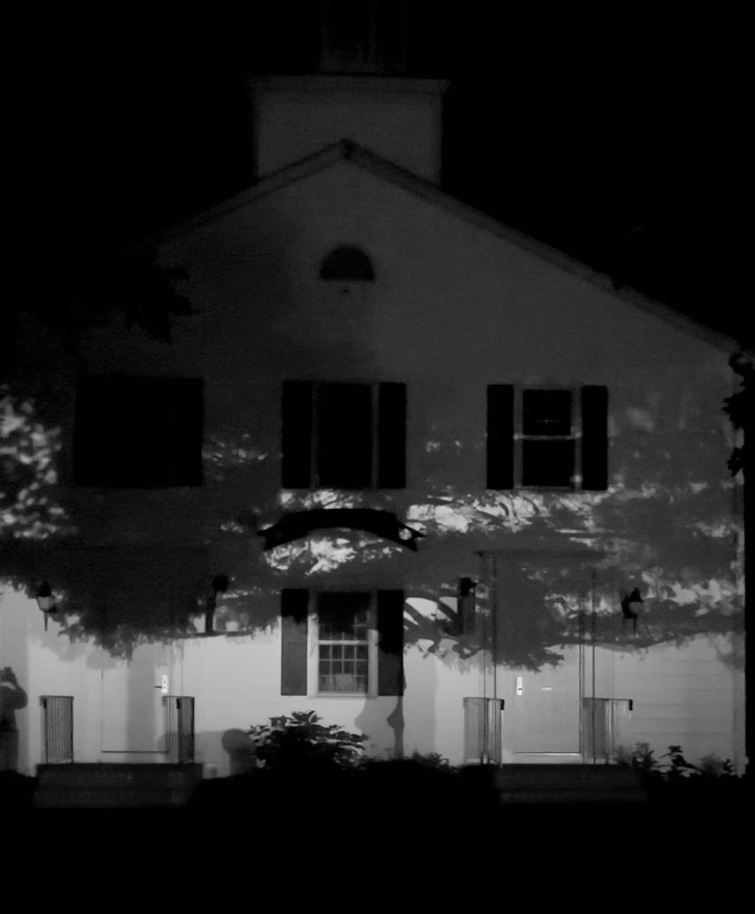 Physicists reveal to us what the careful observer already knows: light changes its form depending on the mode of observation. The art of noticing does something similar: what is revealed with an attunement to noticing what is already there? In this projection project I filmed the action of car headlights making silhouettes through the spruce trees of Town Hall, like a magic lantern from the early days of cinema. The lights of cars passing during the projection will layer themselves on the film I made in the place, revealing the beauty of what is already there.
