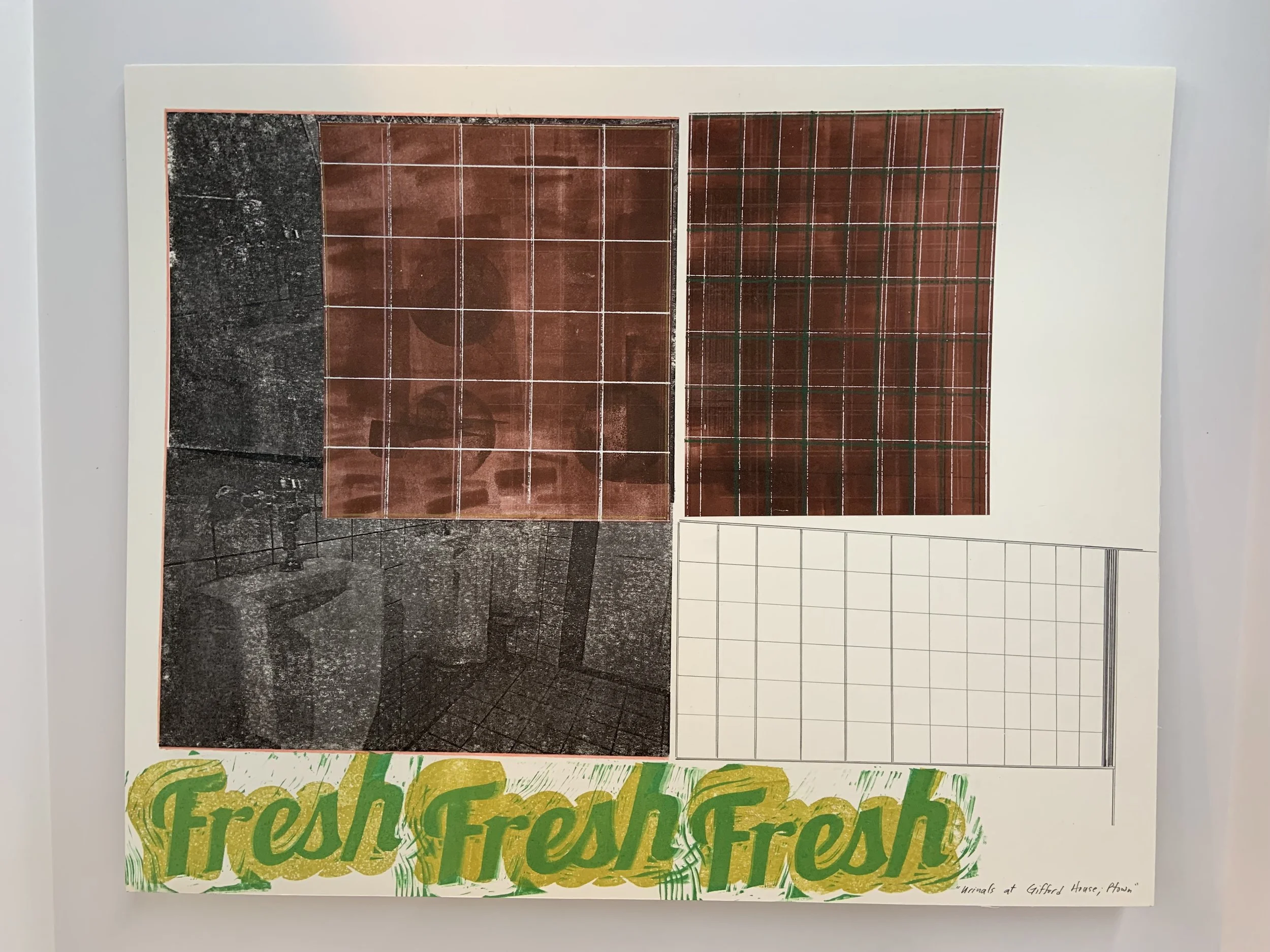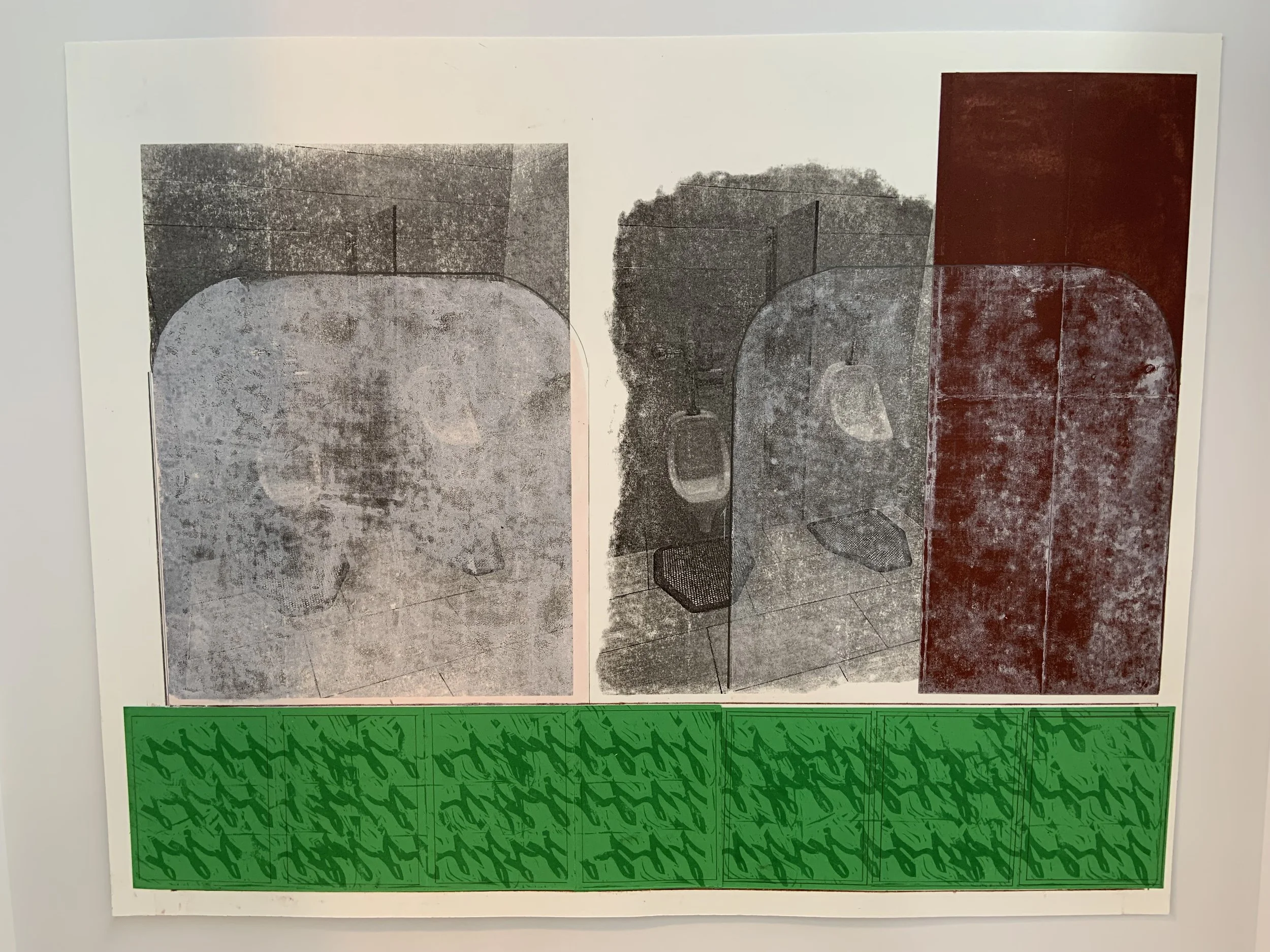 Greetings; Fancy urinals at Yale (March 2025), photo transfer/collage/letterpress, 16 × 20”