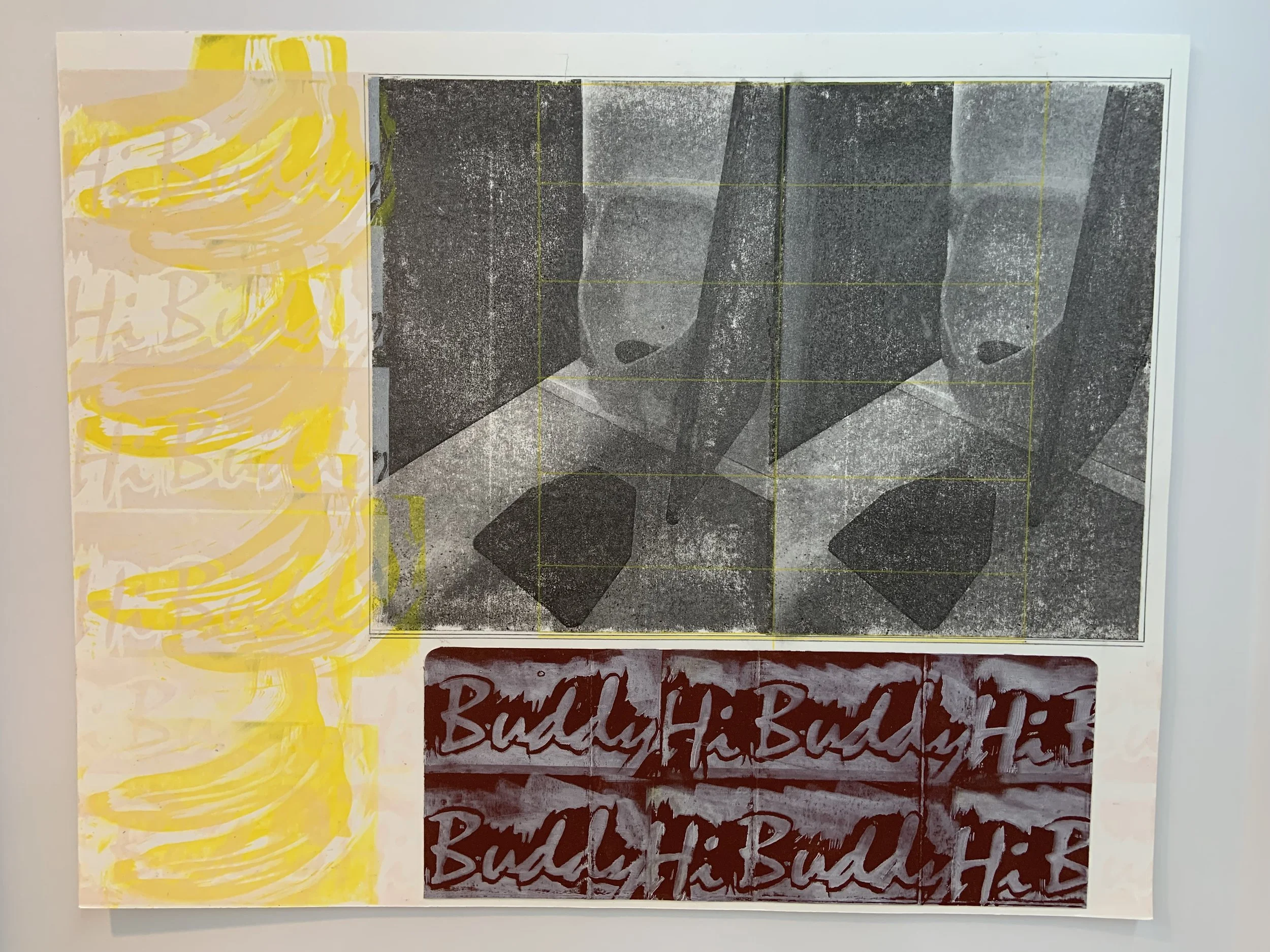 Hi Buddy (February 2025), photo transfer/lino cut/letterpress, 16 × 20”