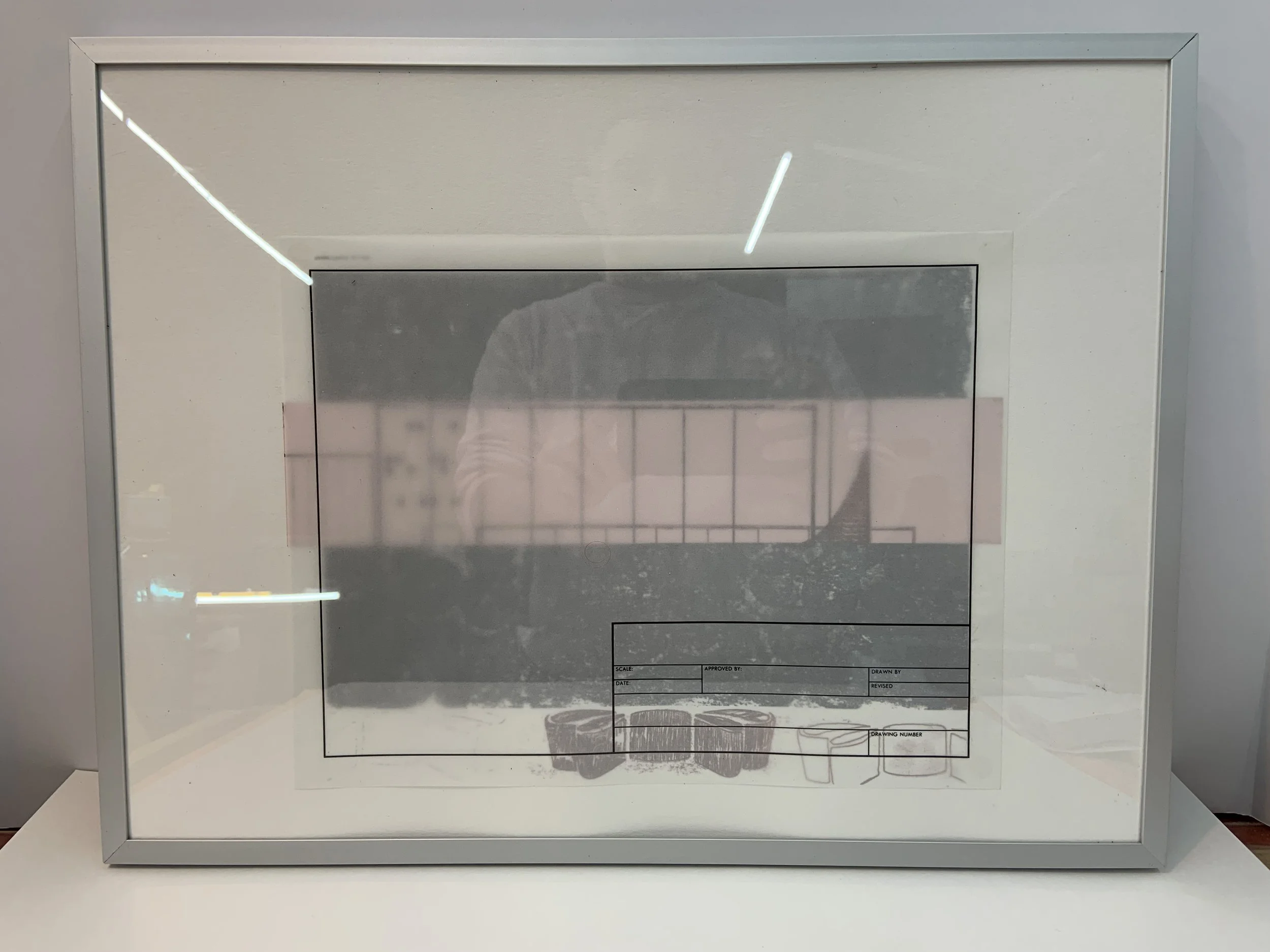 in between (December 2024), photo transfer and drawing, 12 1/2 x 16 1/2”