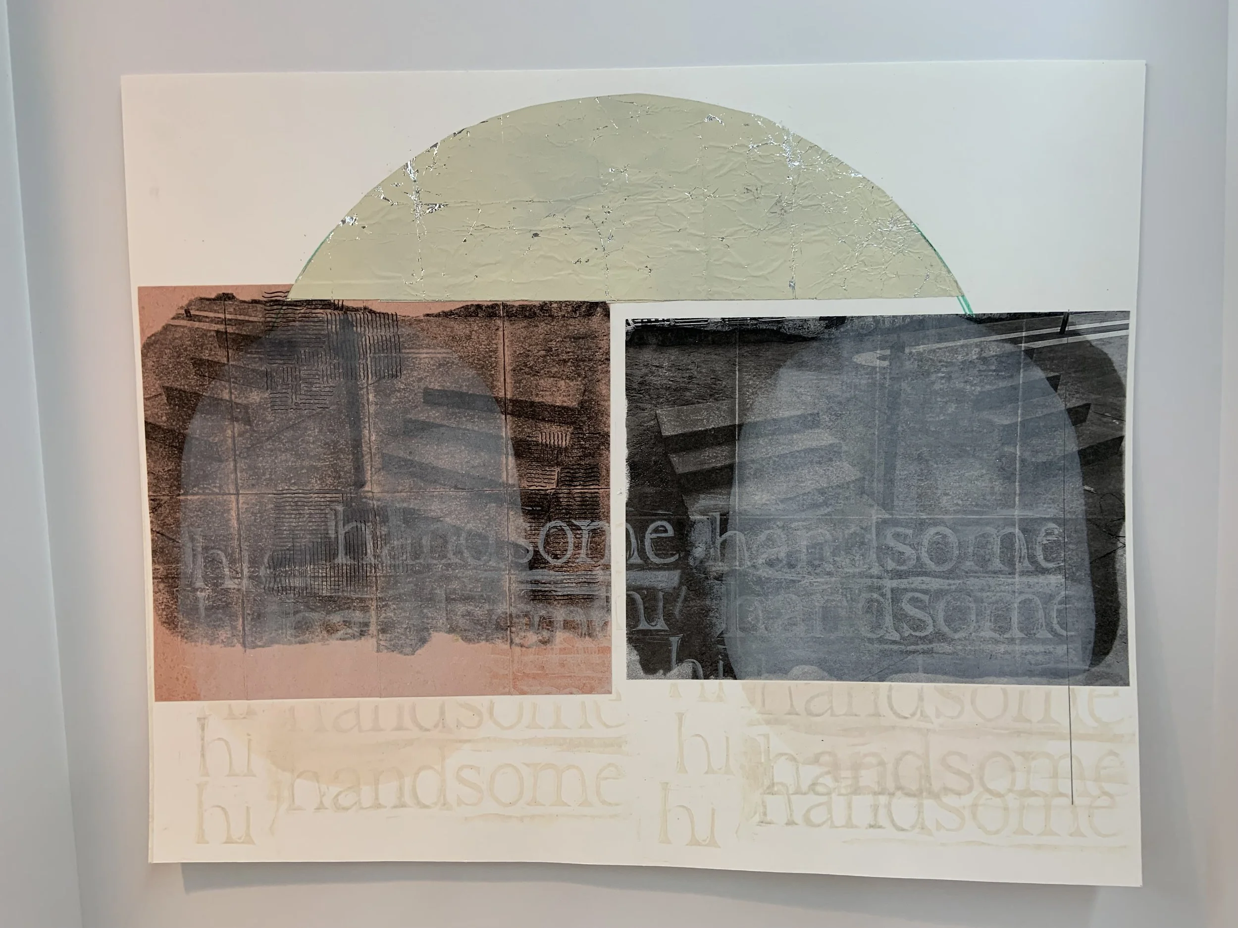 Hi Handsome (February 2025), photo transfer/linocut/letterpress/foil collage, 16 × 20”
