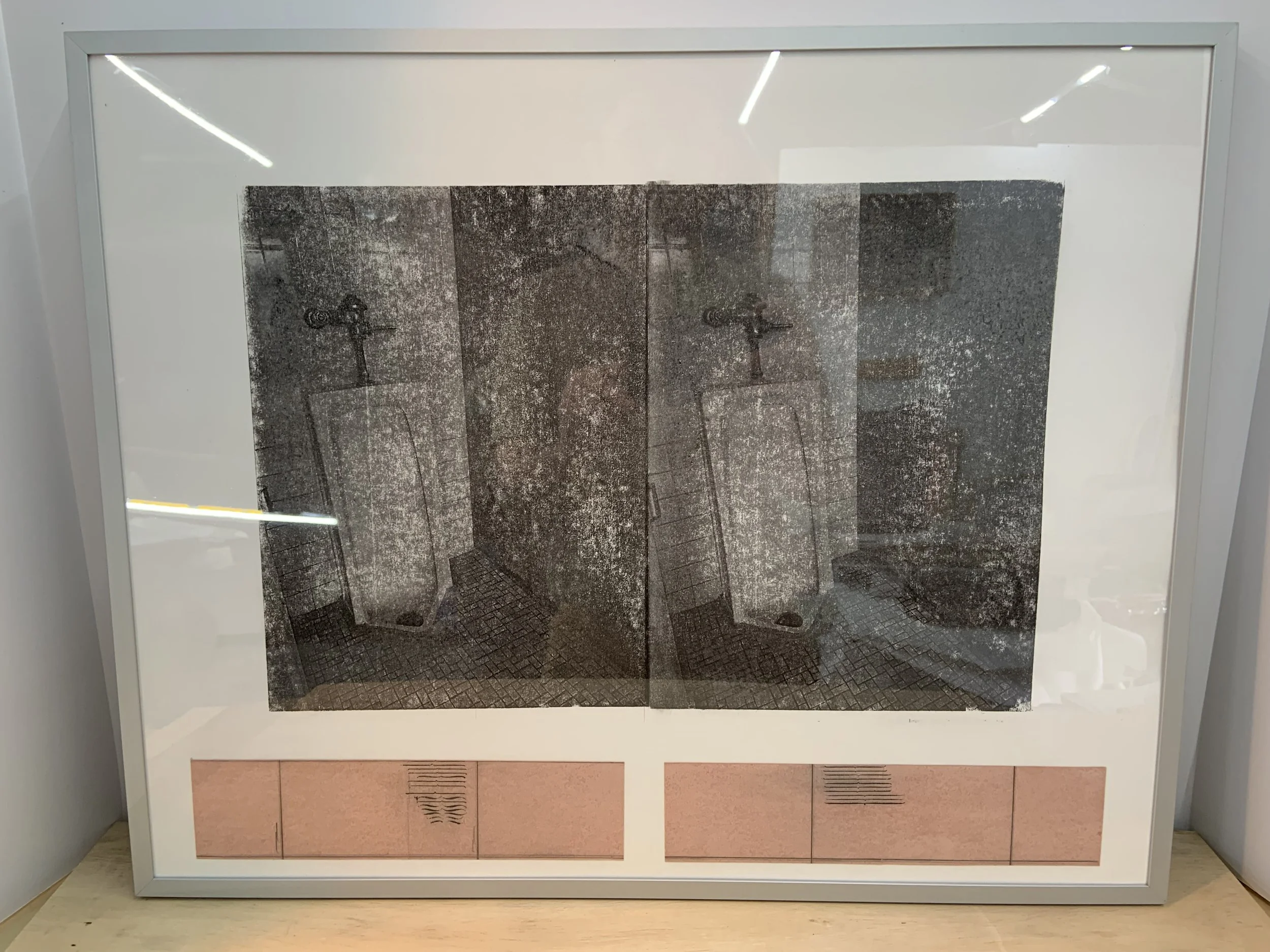 In this collection, KORN turns to the architecture of queer cruising—the coded language of public restrooms and hidden meeting places—as a lens for exploring bodily autonomy, visibility, and risk in a repressive political moment. These charged prints and sculptural works evoke the materiality of tile, plumbing, urine, and surveillance, transforming spaces of marginalization into ones of subversion and connection.